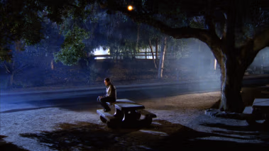 Chuck receives a call from his mother, Mary Bartowski to meet him at Griffith Park. He is sitting on a picnic table. The picnic table is not actually in Griffith Park, but in a park located at
